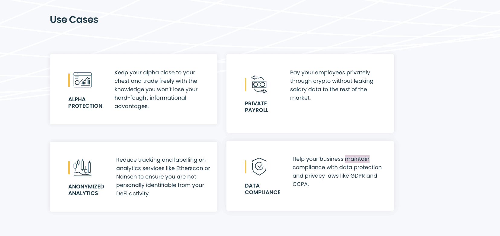 - Staking and yield farming participation without exposing patterns and holdings