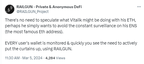 The news of this transaction set the RAIL token alight (its value increased more than 120% in a matter of hours in March 2024, as per CoinMarketCap price data) and also led to substantial online discourse around Buterin’s use of the privacy tool.