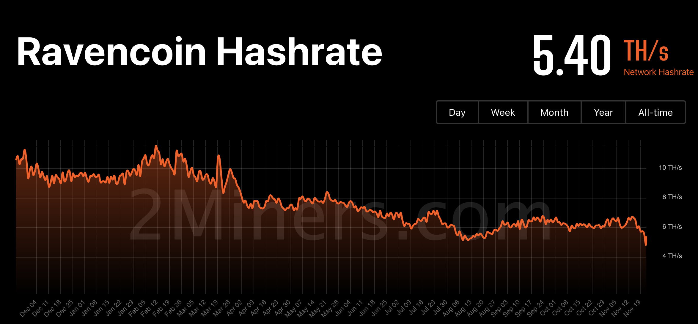 The network upgraded its mining algorithm twice. The first time, it forked from X16R to the X16Rv2 algorithm on October 1, 2019. A second update was from X16Rv2 to the KAWPOW algorithm. The algorithm updates were necessary to prevent x16R ASICs and FPGAs from mining ravencoin.