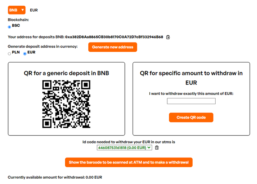 Below this, you can see the address where you will deposit your BNB and an option to choose what fiat currency to receive upon payment. You can scan the QR code for a generic deposit, or you can create a QR code for a specific amount.