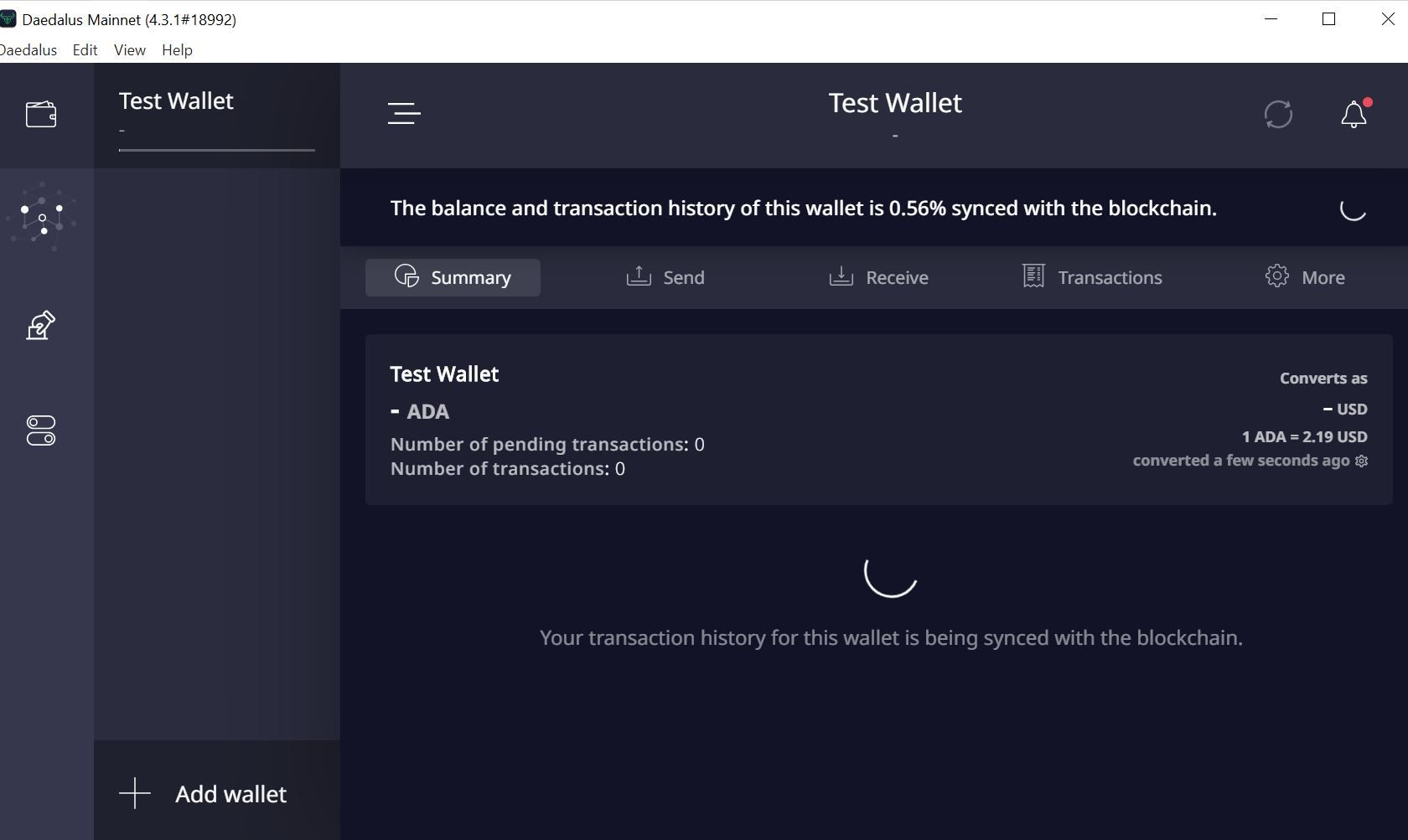 8. Next, you will be taken to your dashboard, where you will find the “Receive” tab and instructions on how to add ADA funds.