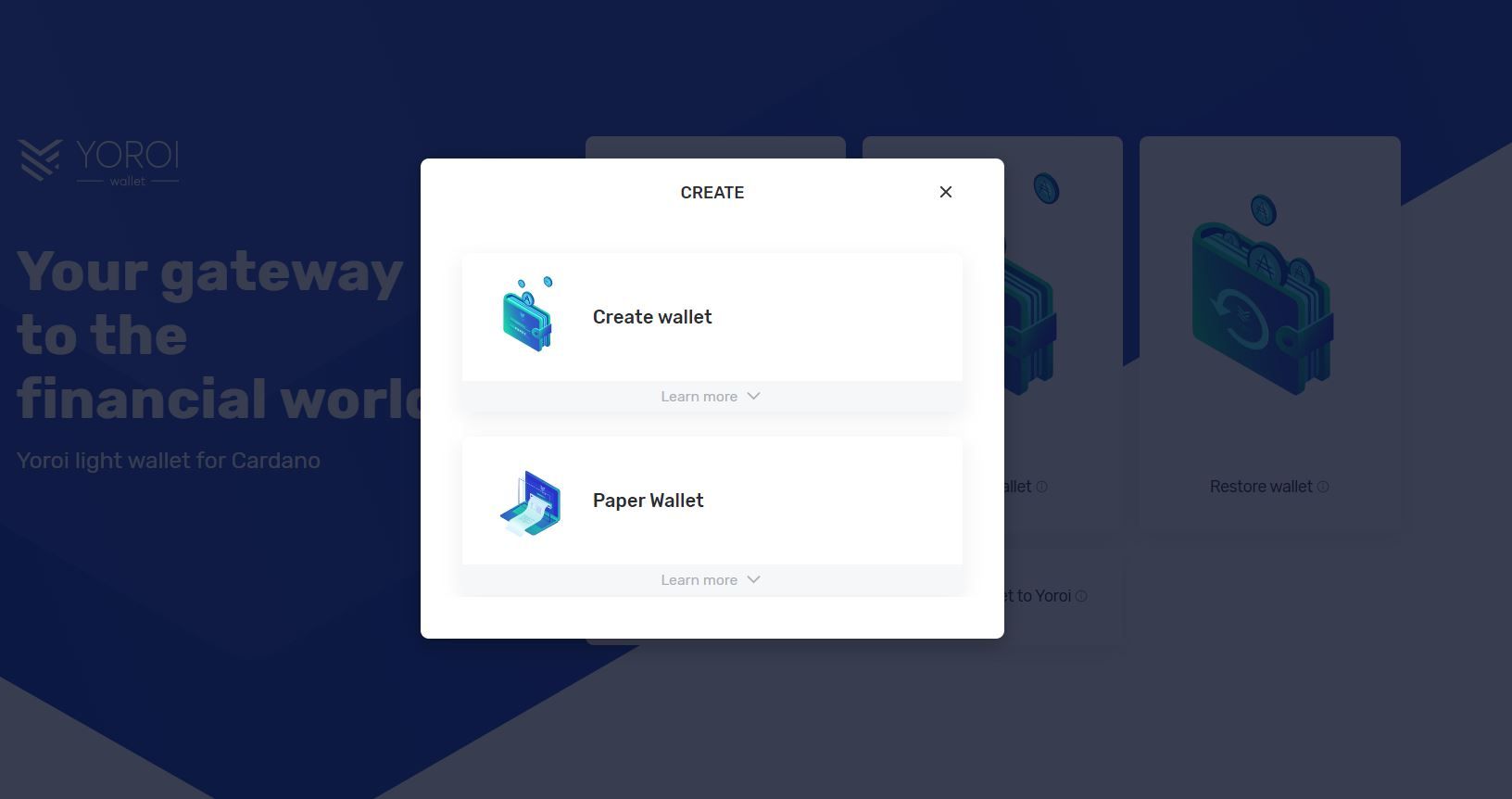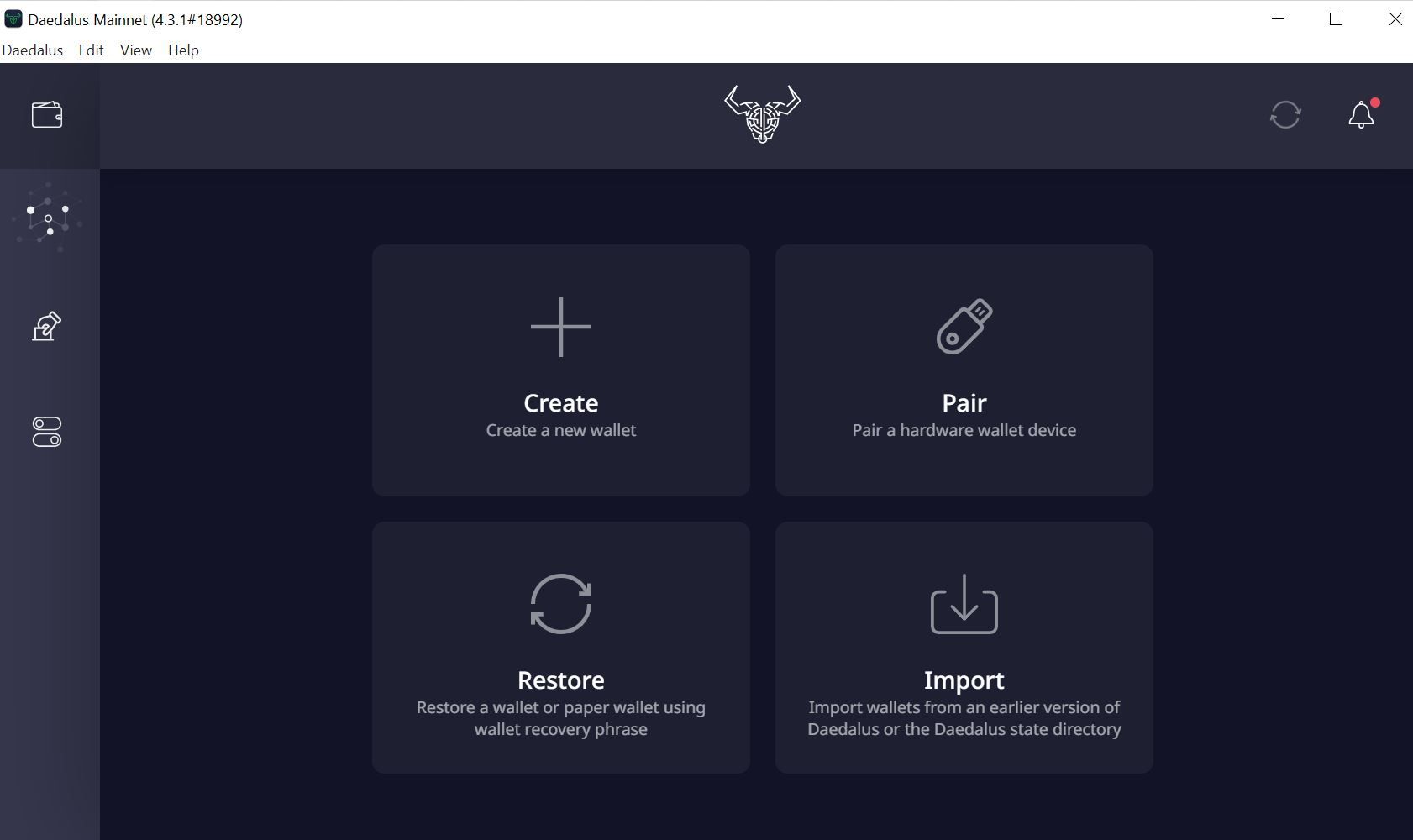 2. Create or restore a wallet. You can create, pair, restore, or import a wallet in Daedalus.