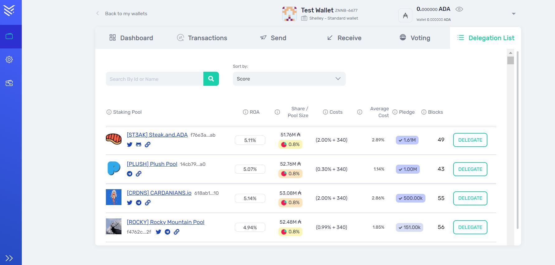 9. After you add funds, you can stake Cardano by choosing one of the staking pools from “Delegation list”.
