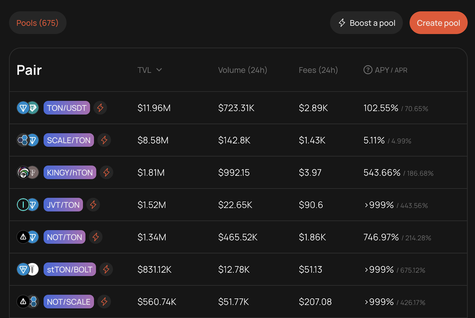 DeDust.io is continuously integrating new features and expanding its list of supported tokens and trading pairs. According to DexScreener, DeDust.io supports 721 pairs. The 24-hour trading volume on the platform sits at $6.7 million.