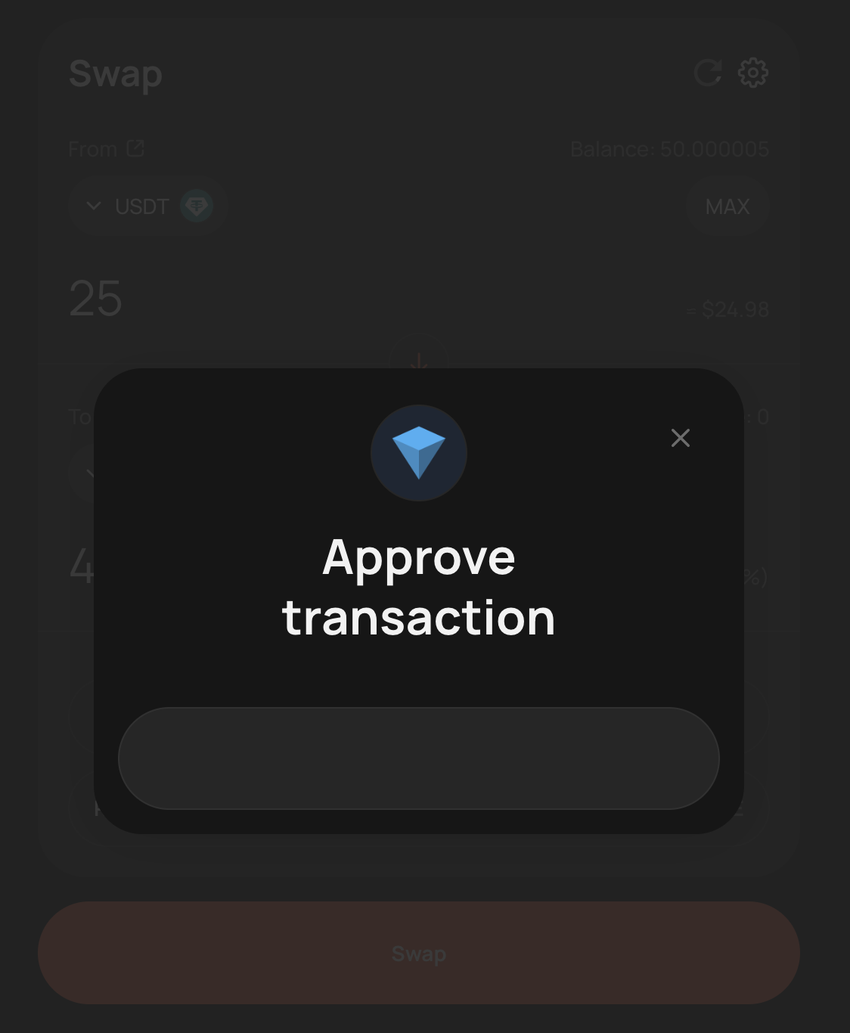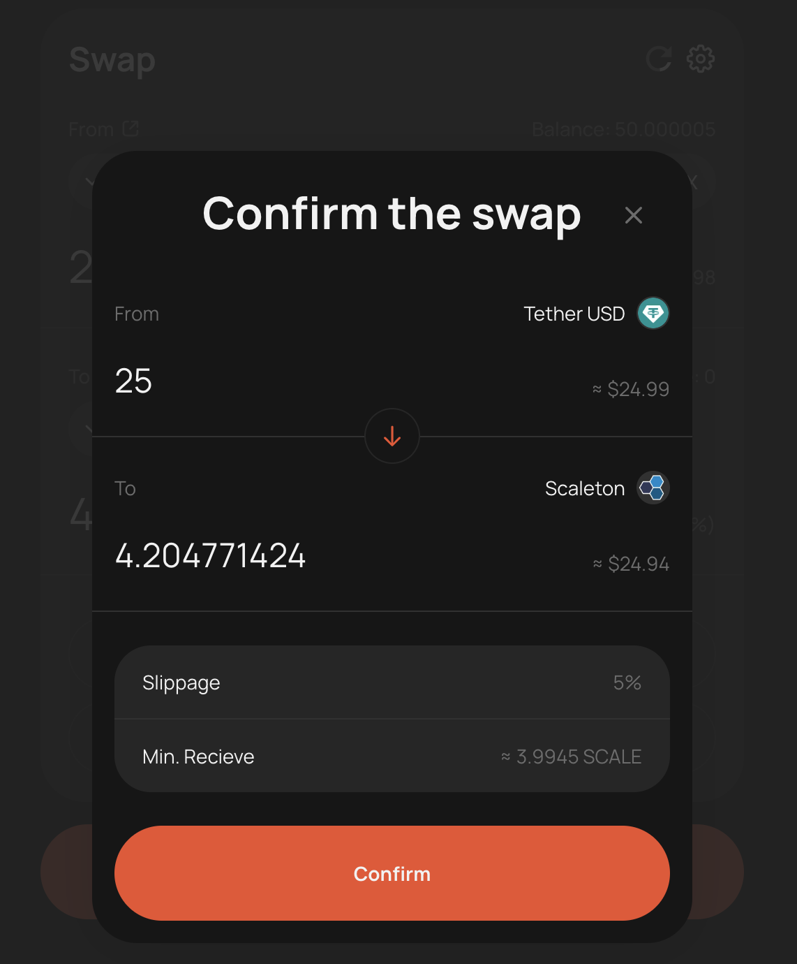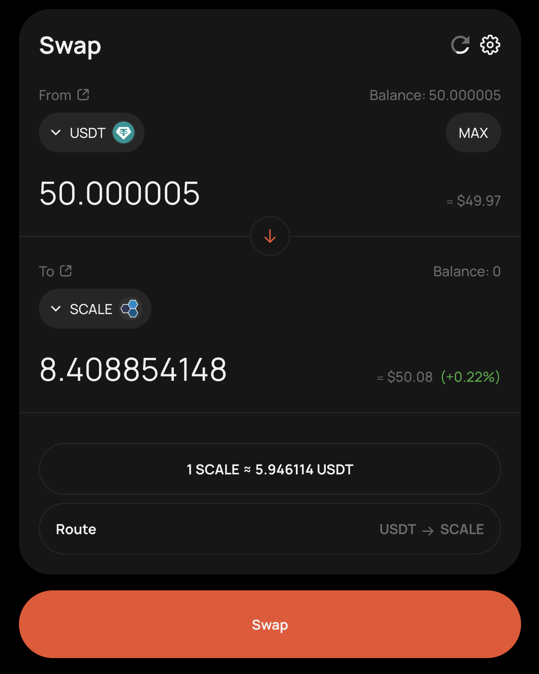 Swap the desired amount of USDT or TON in the DeDust.io itself, in the SWAP section. Tap the “Confirm” button to verify your purchase and proceed with buying the specified number of SCALE. Your wallet will then request confirmation to finalize the transaction on the blockchain.