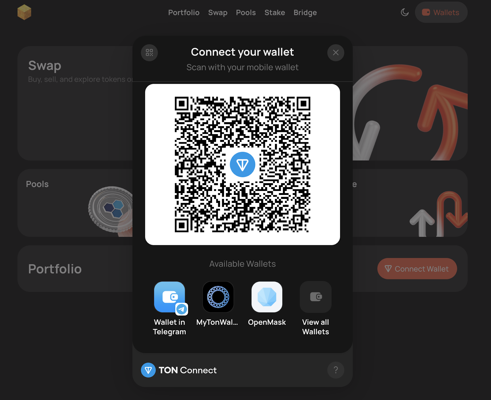 DeDust.io offers several key elements that allow it to give its users the best experience. Let’s look at each of them separately. But first, you have to connect to DeDust.io. Here’s how to do it: the steps are the same for both desktop and mobile versions.