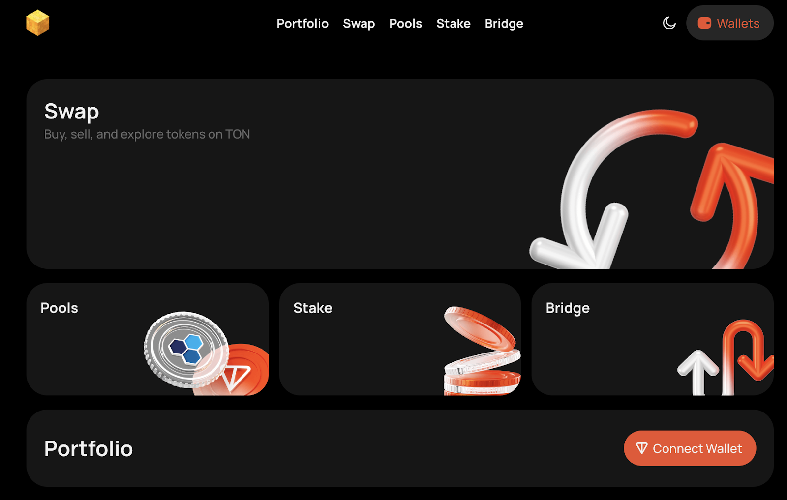 DeDust.io is a leading decentralized exchange (DEX) built natively on the TON blockchain. It allows users to swap tokens and provide liquidity, similar in functionality and features to other DEXs like Uniswap. Since its inception, DeDust.io has become a crucial component of TON’s DeFi landscape.