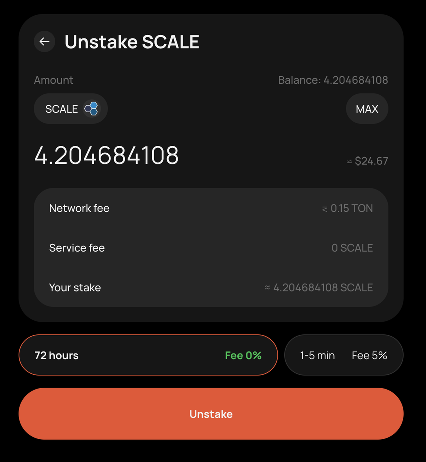 If you want to unstake your SCALE, click the Unstake button and choose how to withdraw your funds. You can either unstake immediately with a 5% penalty or wait 72 hours to unstake without a service fee. A network fee will be charged in either case, as it is required to process your transaction on the blockchain.