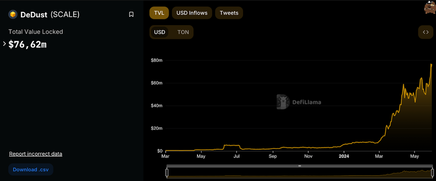 As one of the leading exchanges on the TON blockchain, DeDust.io reflects the increasing interest in this ecosystem. DefiLama data shows the platform’s TVL soared from $5.58 million in January 2024 to an impressive $76.62 million as of late May.
