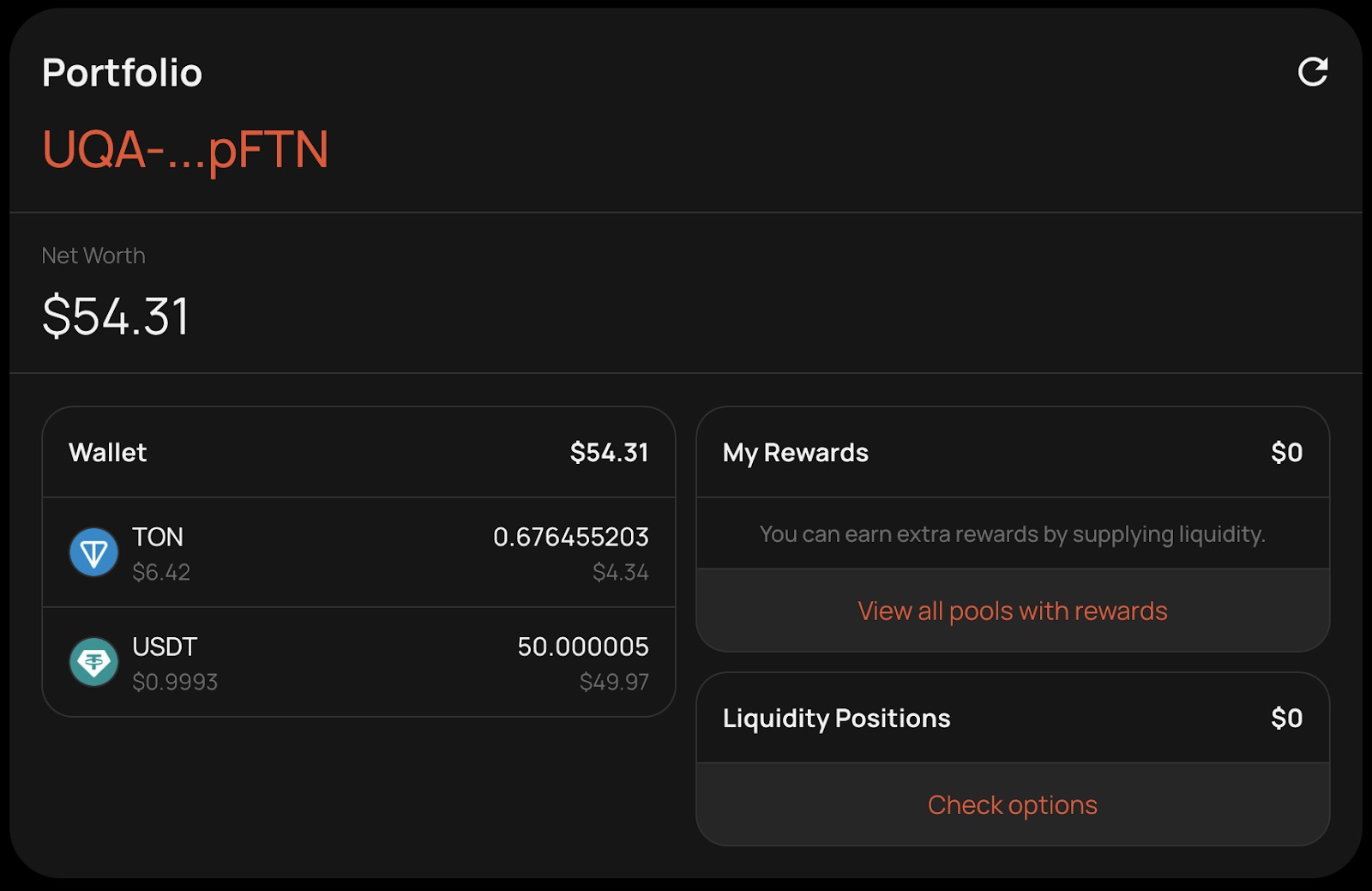 Here you can exchange one token for another: choose the assets, specify the amount you want to swap and don’t forget you’ll need some TON to cover network fees.