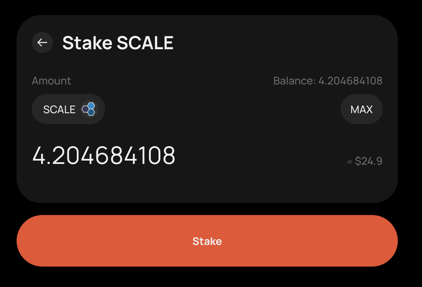 Now, when you have your SCALE ready, go to the Stake tab and specify the amount of SCALE you want to stake.