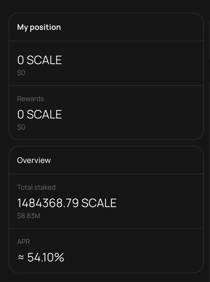 As of May 2024, users can stake SCALE with ≈ 54.10% APR. Just three weeks after the tool’s launch, the number of staked tokens has surpassed 1484373.79 SCALE, worth about $8.8 million.