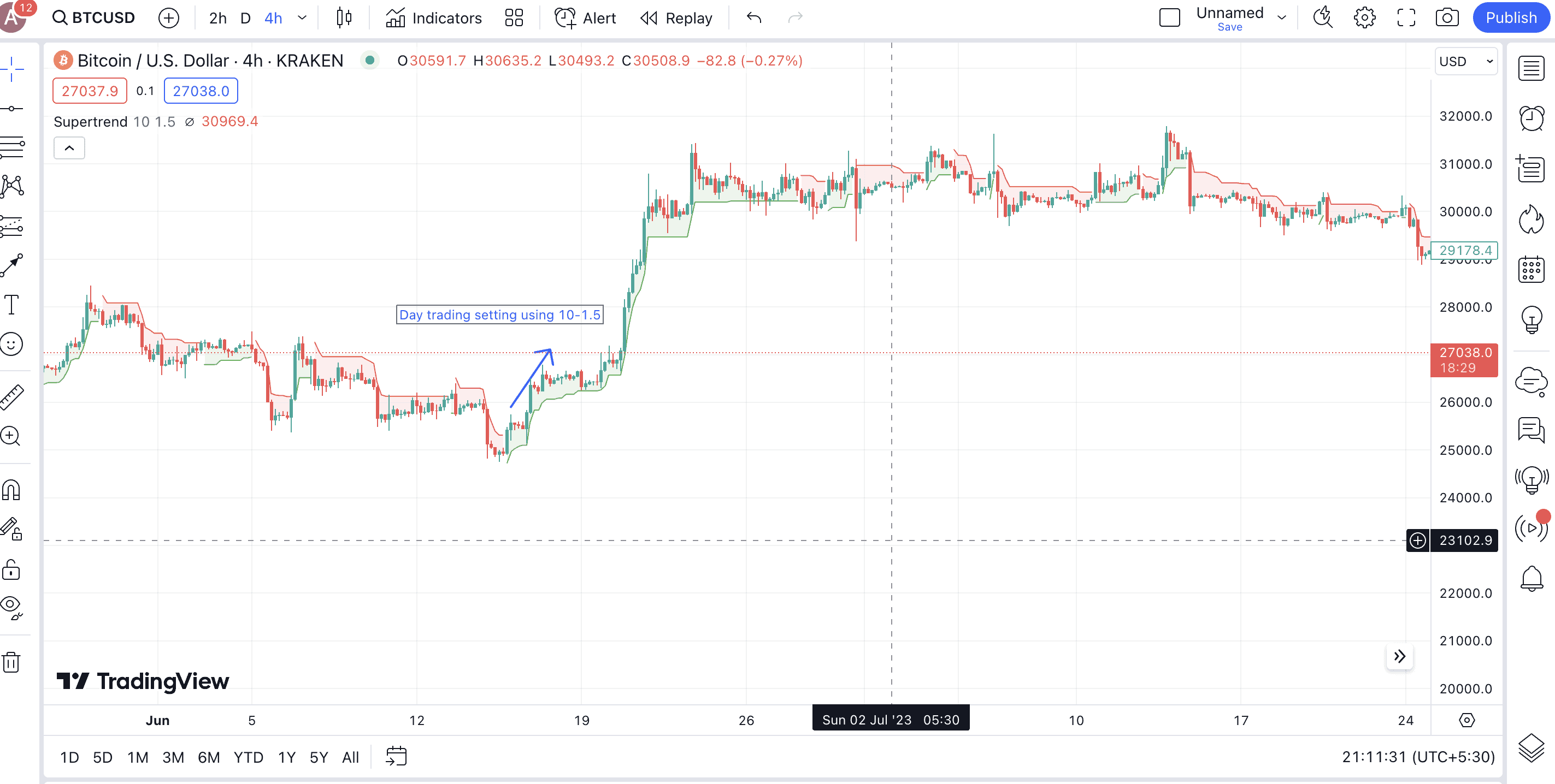 When the price moves in a particular direction — upwards for a long trade — the Supertrend line keeps moving with it. Therefore, you can adjust your stop loss accordingly by using the moving Supertrend line as a trailing stop loss instrument. This approach allows you to lock in quick profits and safeguards you against potential reversals.
