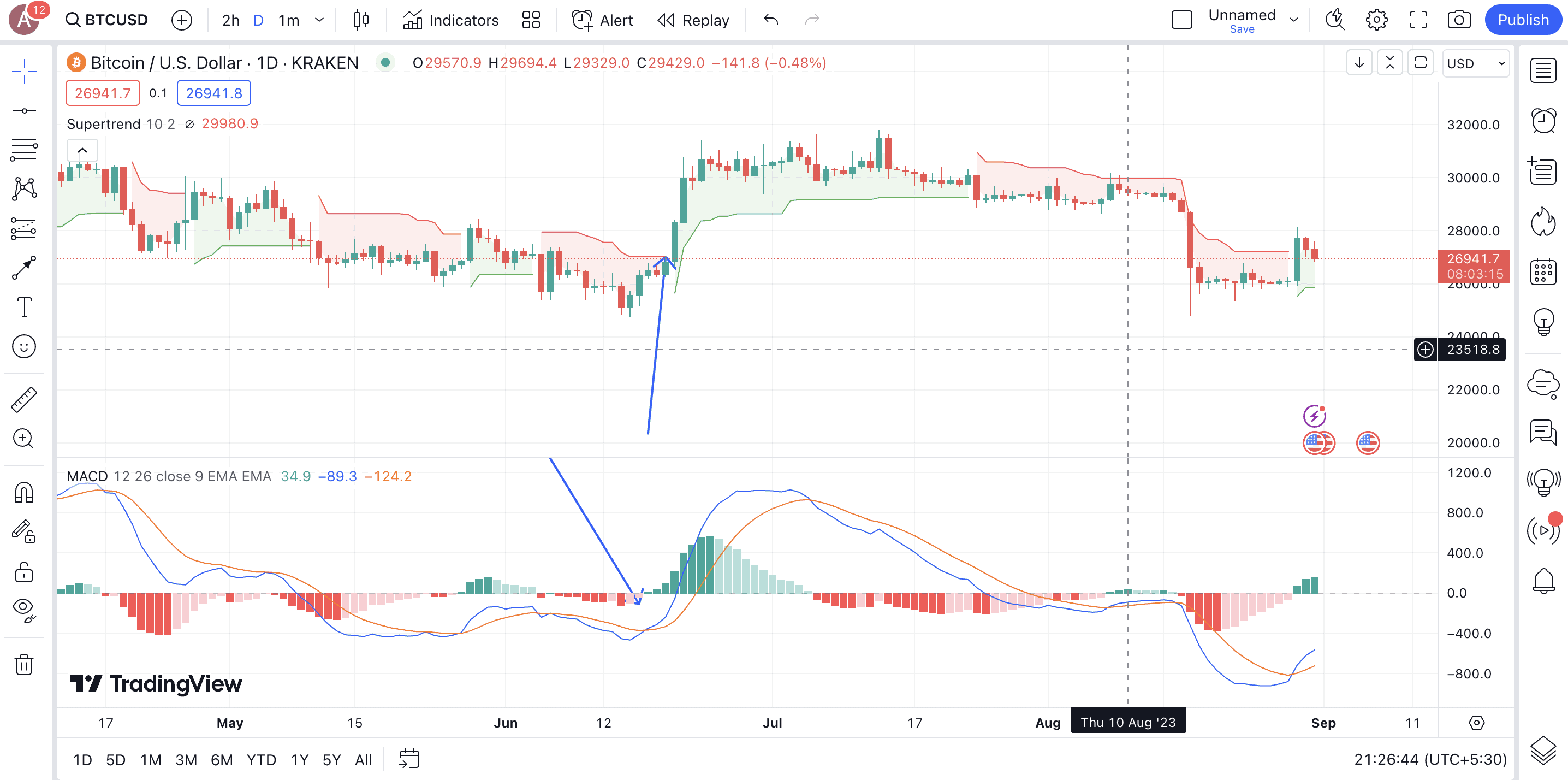 Bollinger Bands (BB) is a reliable volatility indicator. As the Supertrend indicator takes volatility into consideration, it is expected to work really well with BB. To get started, check if the price reaches the lower leg of the Bollinger Bands — the oversold segment — and the Supertrend Indicator turns green; it might hint at a buying opportunity.