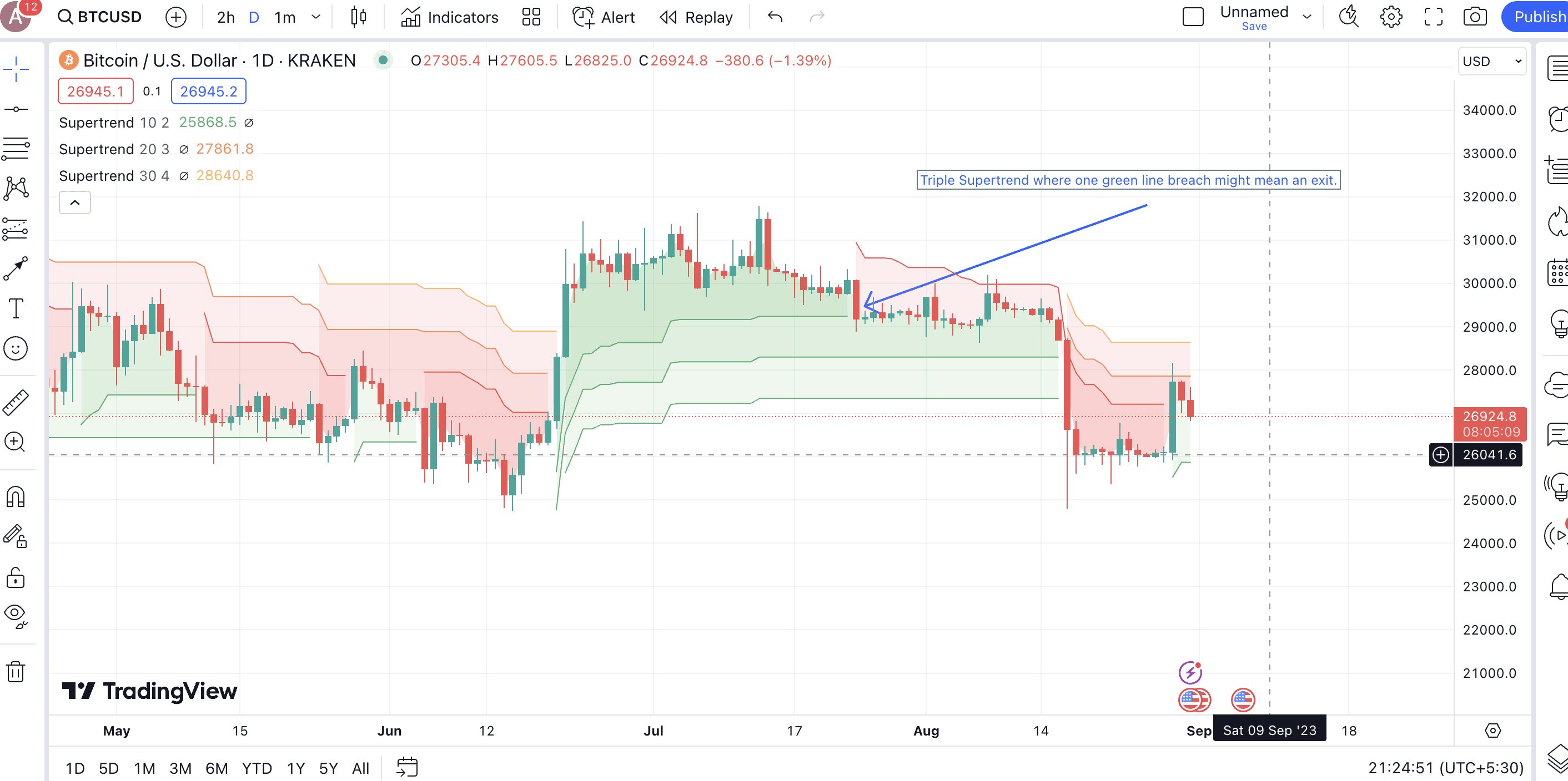 The idea is simple. If the Supertrend line transitions from green to red, it offers a strong sell signal. This move indicates a short-term or long-term trend shift from bullish to bearish. Traders who are already holding positions can exit when the price breaches the green and the red starts appearing.