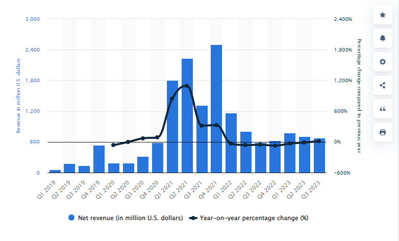 Coinbase went public in Apr. 2021. As of Q3 2023, the company’s quarterly revenue stood at nearly $675 million, up 14% year-on-year.