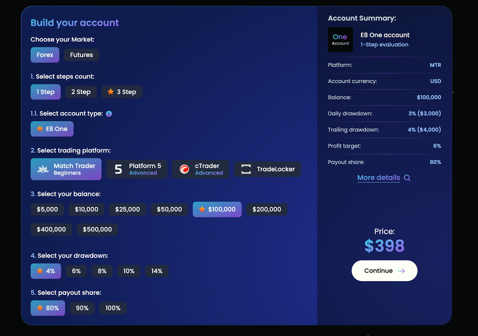 E8 Funding promises to give you full control over how you take on the evaluation challenge. You can choose between one, two, or three-step evaluations, each with adjustable profit targets, drawdown limits (ranging from 6% to 14%), and payout structures. That means you can tailor the challenge to match your risk tolerance and trading strategy.