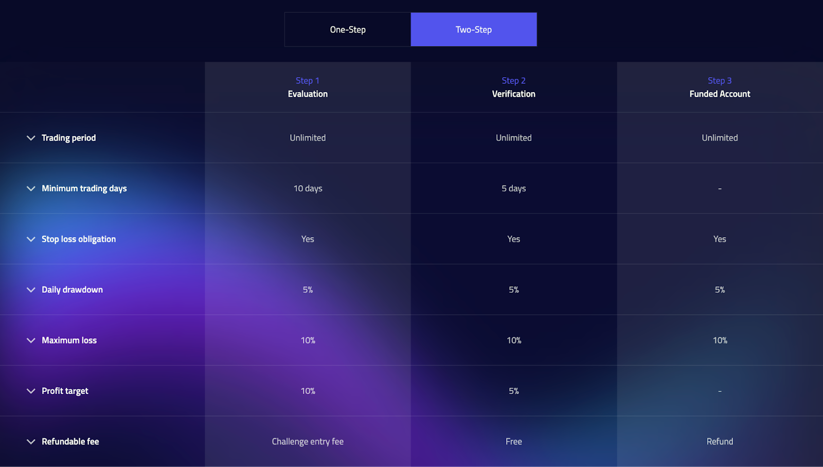 - The 1-step challenge has very tight drawdowns, making it a risky product.