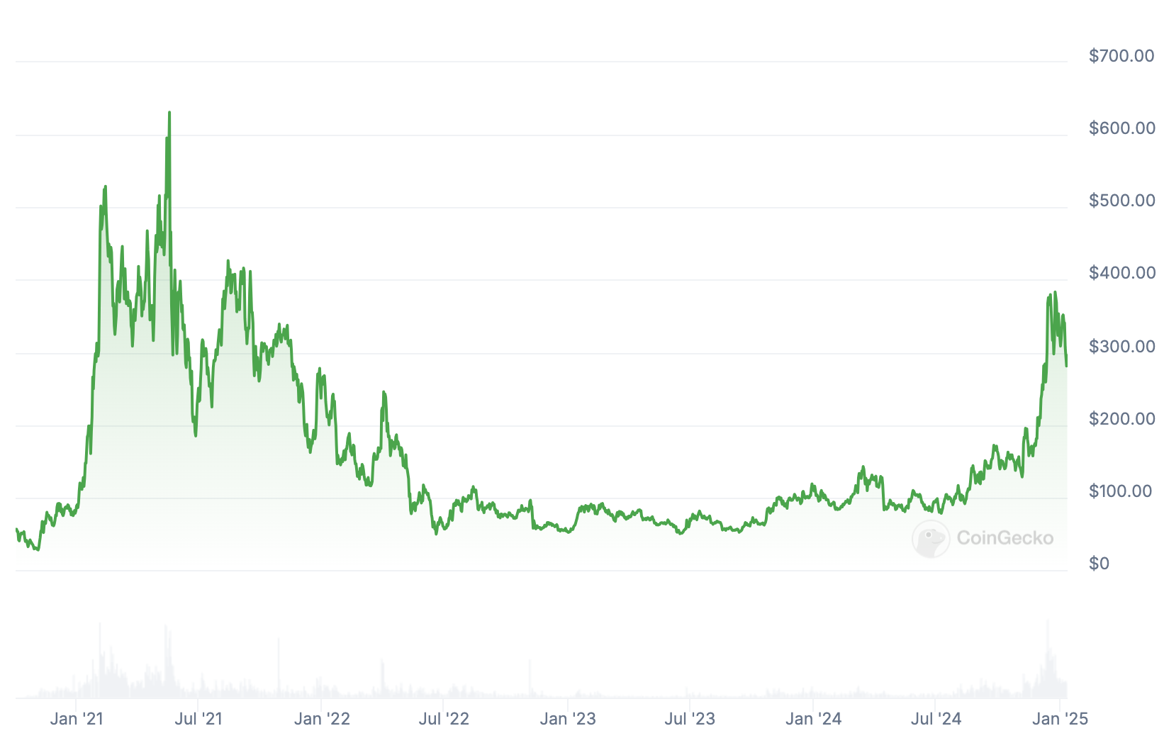 While the price of AAVE, the platform’s native governance token, has not yet surpassed it’s 2021 all-time-high of $661.69, the token has made a solid recovery from 2022 and 2023 lows, sitting at $298.20 in mid-January 2025.
