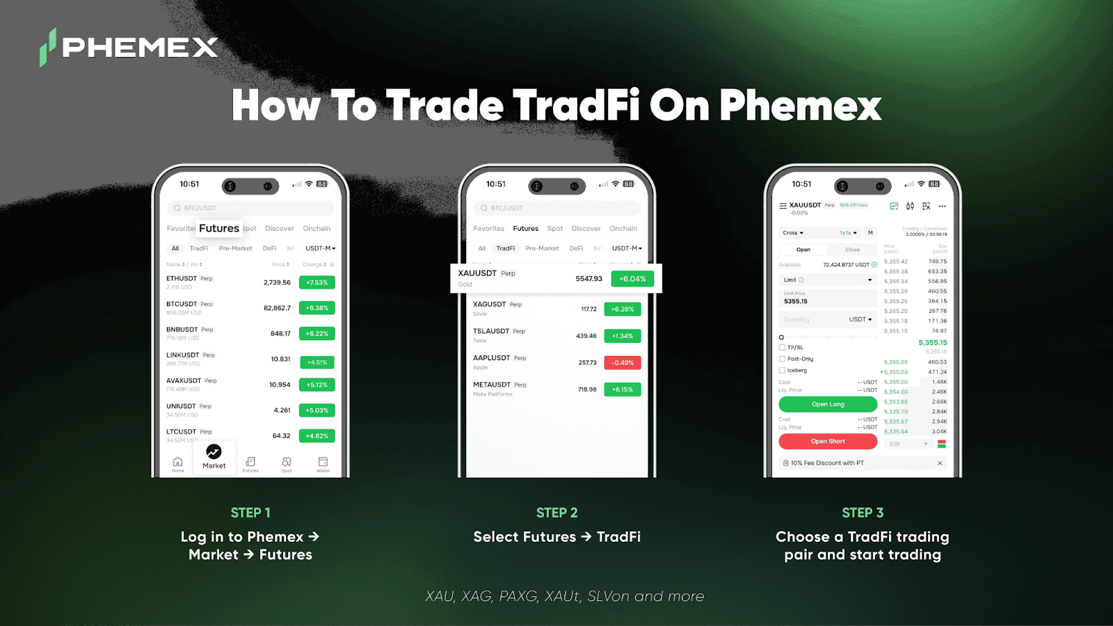 Phemex lists futures contracts that track the prices of selected traditional assets. These contracts allow price exposure using the same futures system already used for crypto.