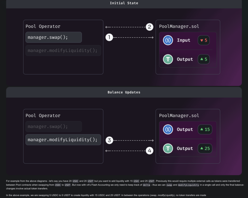 Before (v3): Every time you swap tokens, Uniswap transfers tokens back and forth multiple times per trade.