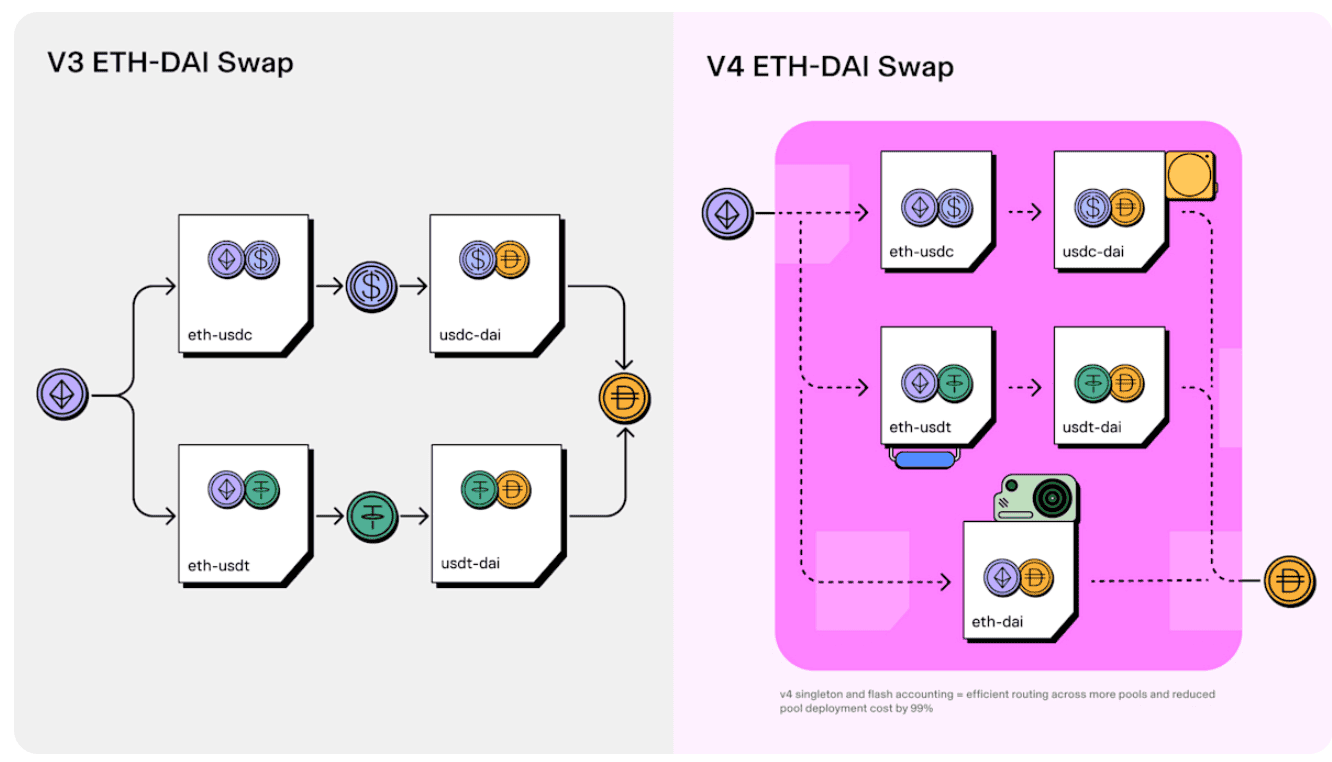 Now (v4): One big contract (Singleton Design) handles all pools under one roof, significantly reducing gas fees.