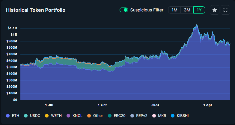 Vitalik’s net worth is reportedly around $1.025 billion as of June 13, 2024. The majority of his wealth is attributed to his ETH holdings. Vitalik Buterin currently holds 278,524 ETH (~$1M) and 256 WETH ($919K), making him one of the largest holders of ETH.