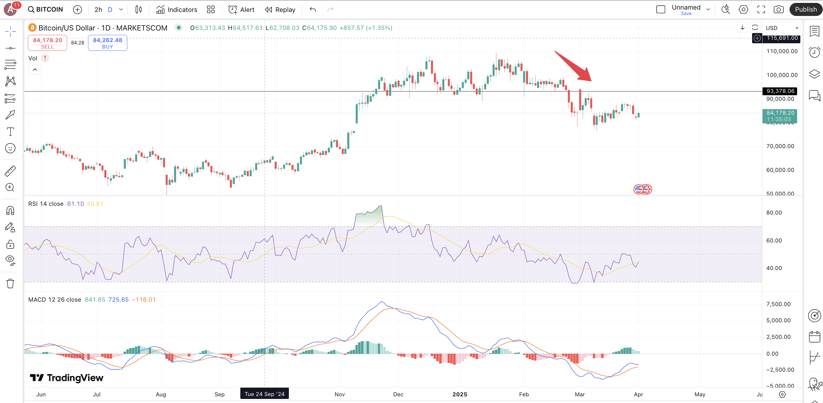 - MACD bearish crossover: When the MACD line crosses below the signal line, it signals weakening momentum.