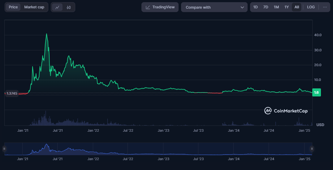 ➤ As of Feb. 10, 2025, PancakeSwap has a Total Value Locked (TVL) of $1.67 billion. Note that this figure is specific to the BNB Smart Chain only and do not reflect the corresponding figures on other chains. The CAKE token is trading at approximately $1.60.