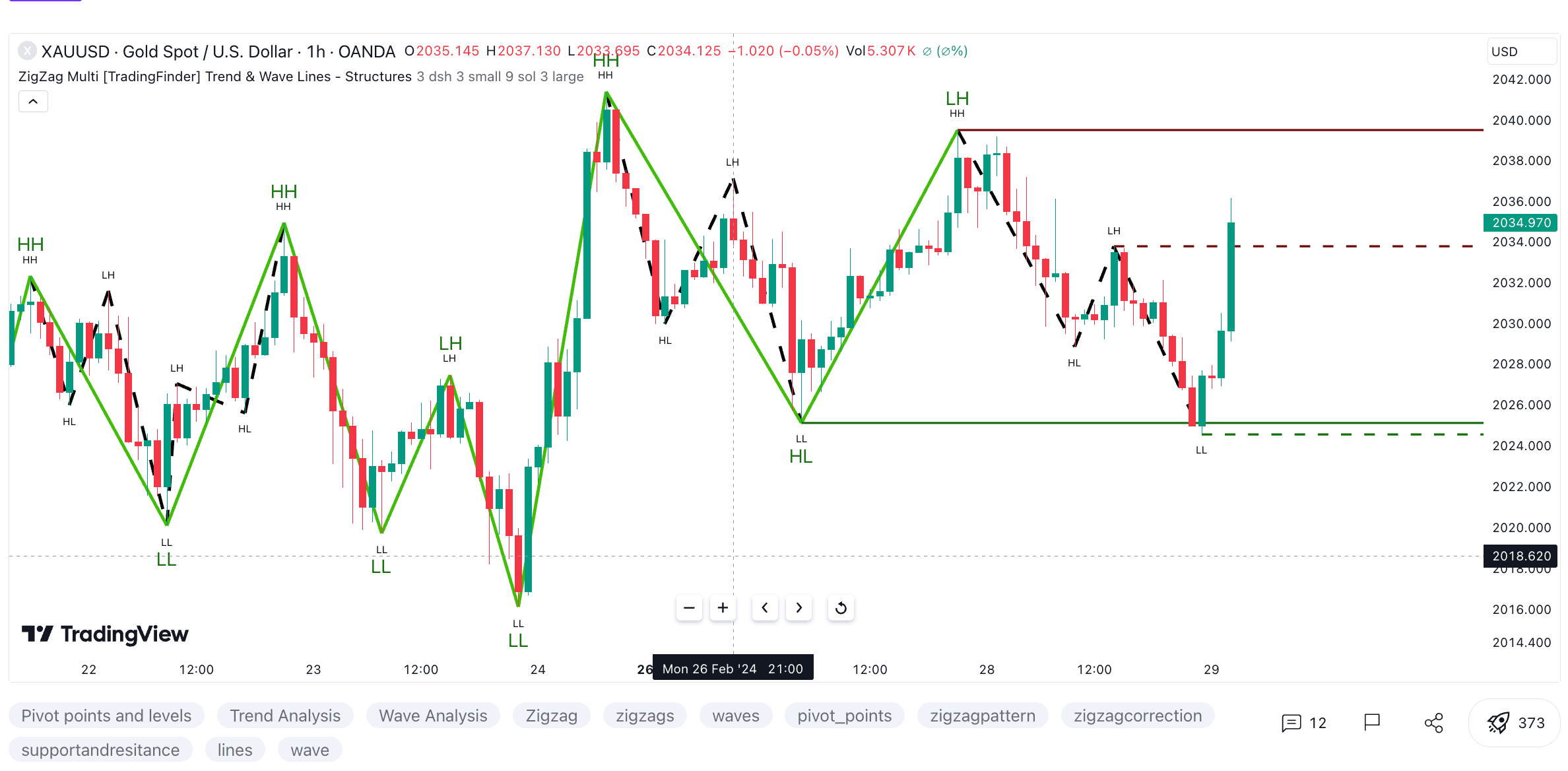 The ZigZag indicator is a technical analysis resource that can clearly identify swing highs and lows using straight lines. This indicator can be paired with the Fibonacci Retracement tool to help locate key support and resistance levels.