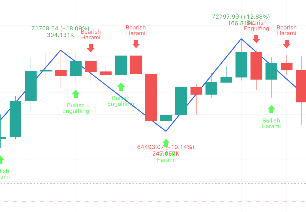 In addition to the mentioned strategies, you can look for key candlestick formations at the swing highs and swing lows to track potential reversals. Above is a quick example of it showing a “Bullish Harami” candlestick formation coinciding with the swing low for BTC at almost $65,000. The price moved to almost $73,000 within a few trading sessions.