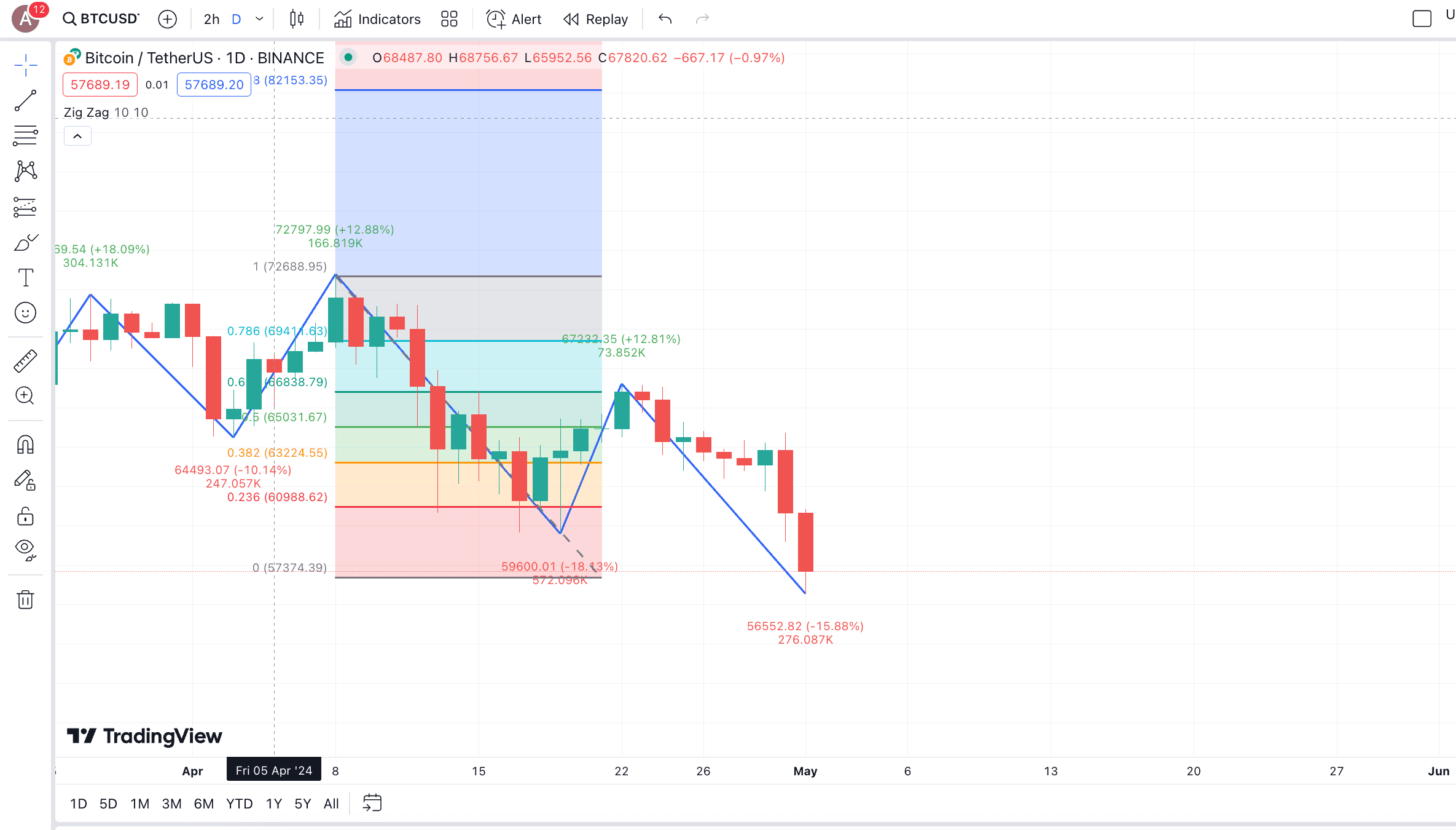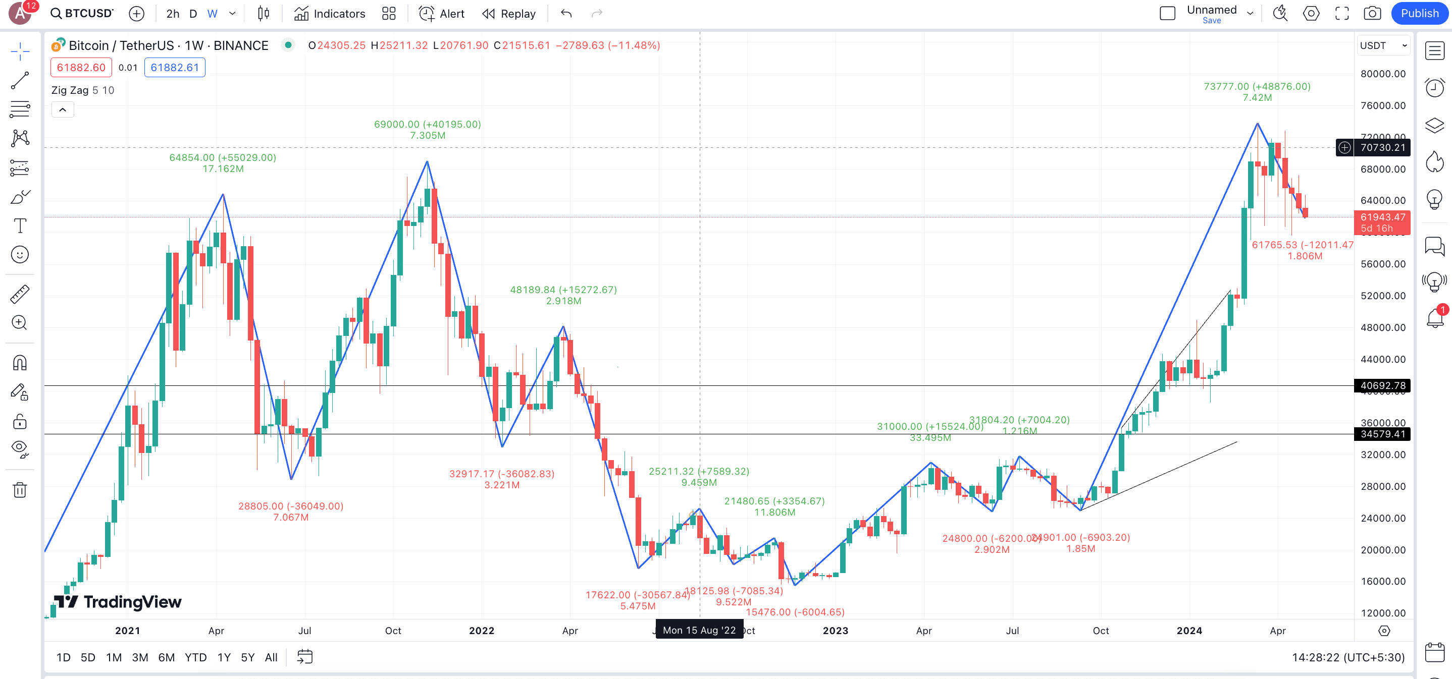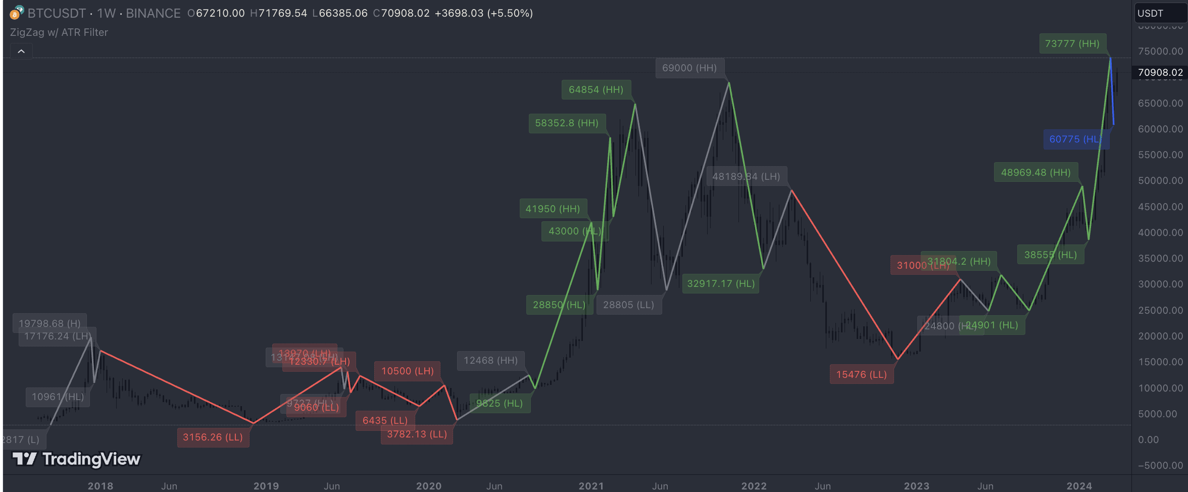 ZigZag indicators are primarily straight lines. Therefore, you can use them to identify classical chart patterns like double tops, head and shoulders, triangles, and more. Below is a quick chart showing the double top formation at closer to $72,000 both times. This showed BTC bulls lacked strength, leading to a sizable price correction.