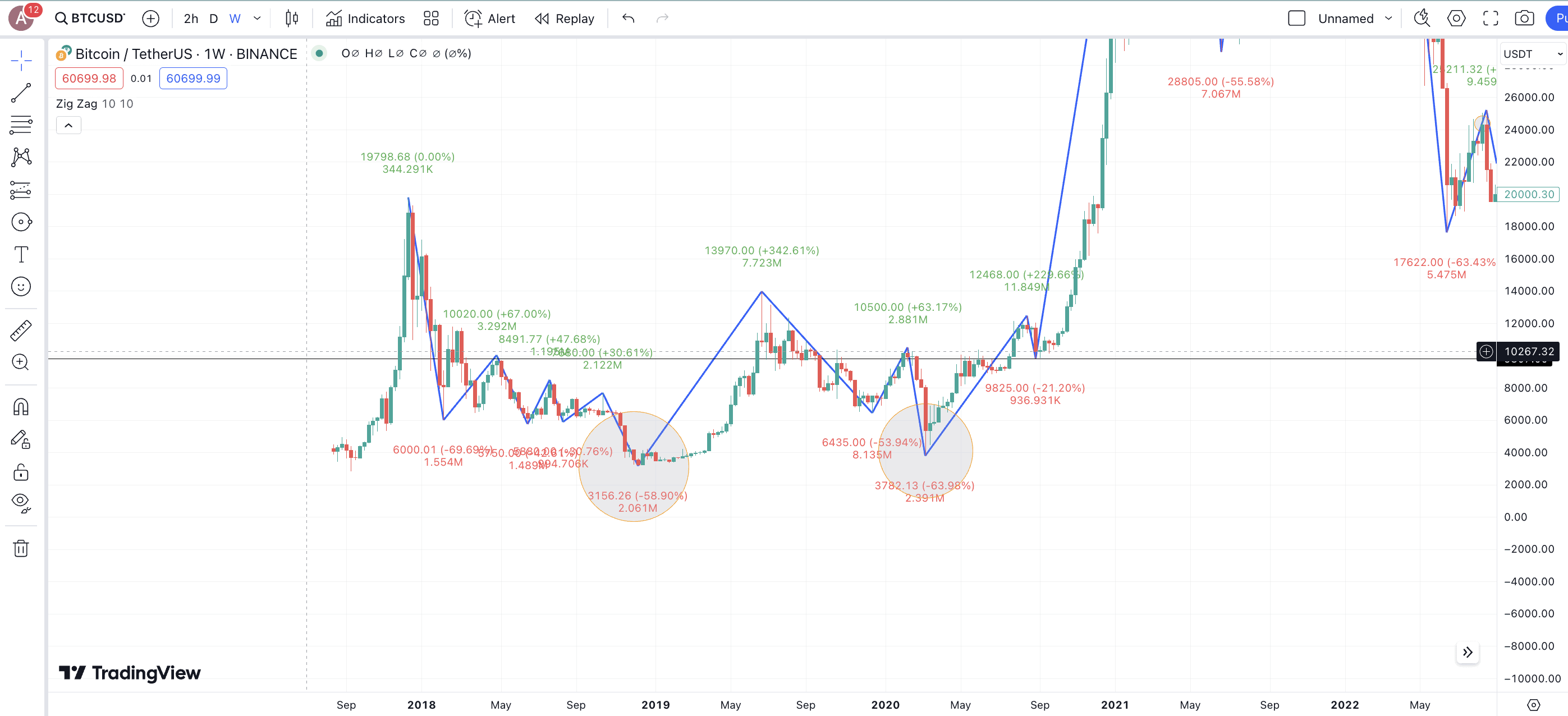 The ZigZag indicator helps you locate the historical support and resistance levels. Notice how, in the case of BTC, the low made in December 2018 acted as a significant support level, which was respected during other downturns and corrective phases.