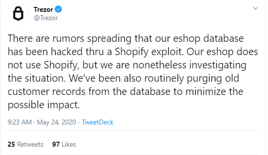 One Ethereum forum hacker is claiming to have the databases for Trezor and Ledger plus other precious information. The databases are said to be obtained through a Shopify exploit. The hacker also claims to have the full SQL database for BankToTheFuture. They’re currently up for sale, but it may all be a ruse.