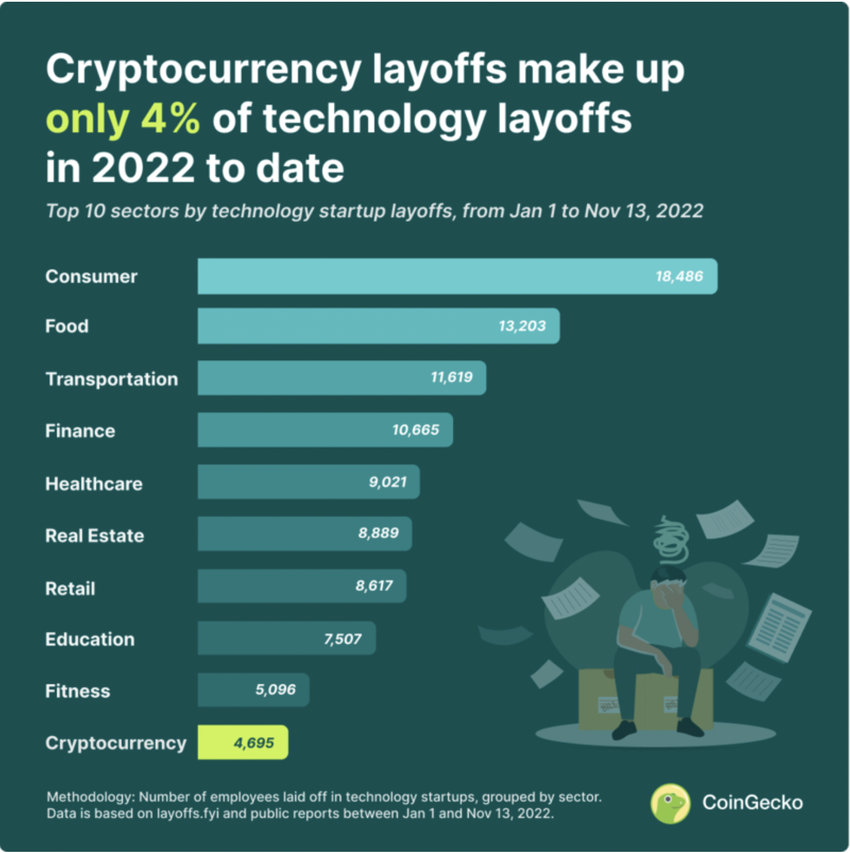 2022 is witnessing the worst lay offs since Covid. According to a CoinGecko report released on Nov. 14, the crypto sector saw 4,695 lay offs which makes up 4% of the entire tech industry.