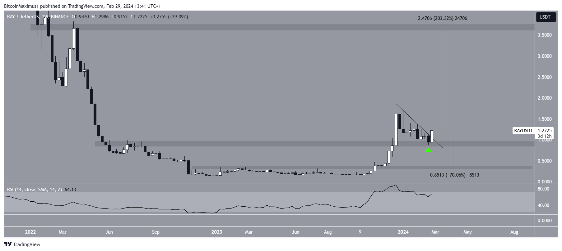 SponsoredSince the bounce, RAY is breaking out from a shorter-term descending resistance trend line. Even though the RSI has fallen since December 2023, it is still above 50 and seemingly regained its footing this week. If the breakout is successful, RAY can increase by 200% to the next resistance at $3.70.