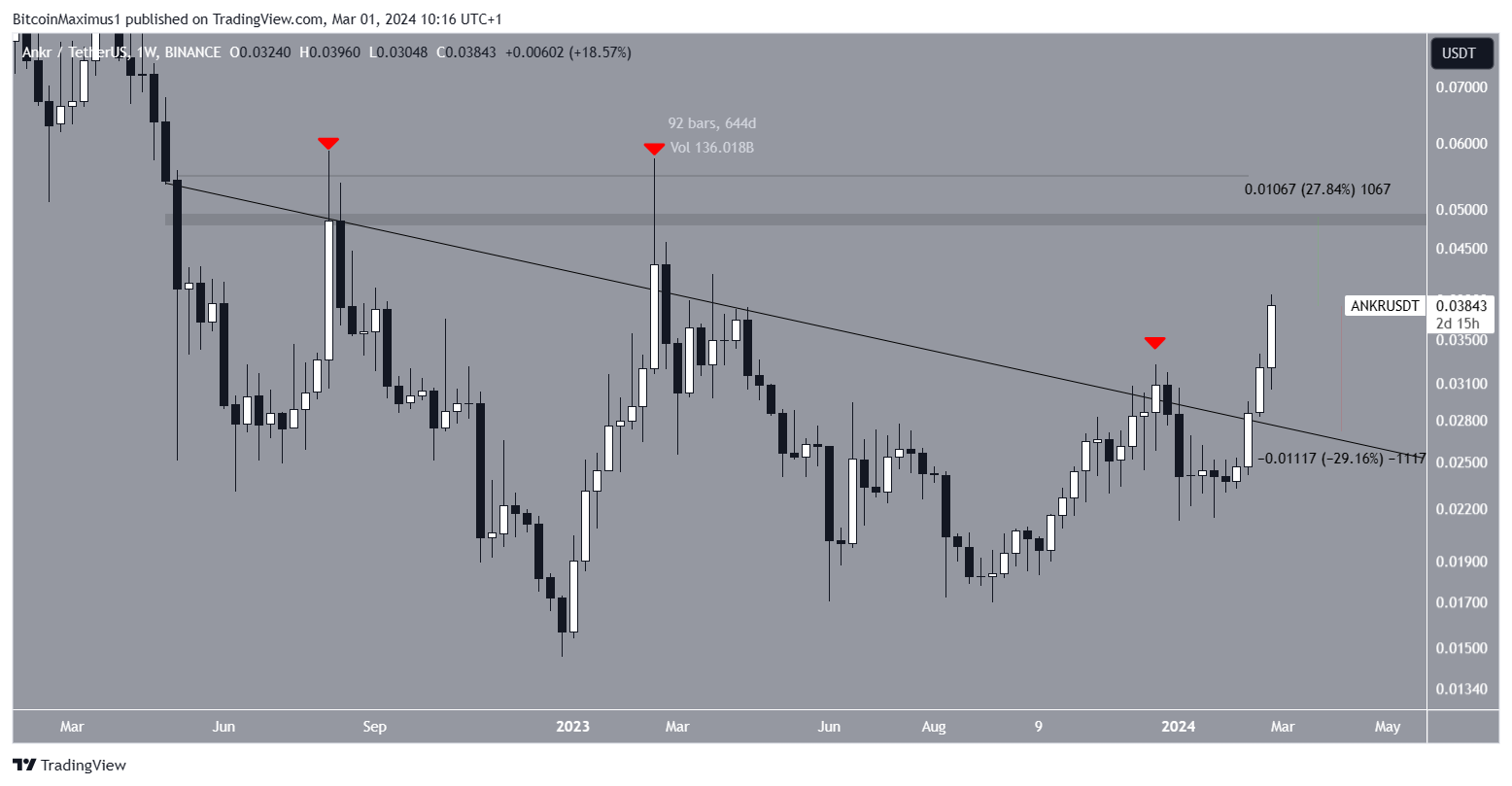 The ANKR price had fallen under a descending resistance trend line since May 2022. The trend line caused three notable rejections, all creating long upper wicks. However, ANKR began an upward movement in February 2024 and broke out from the 644-day descending resistance trend line.