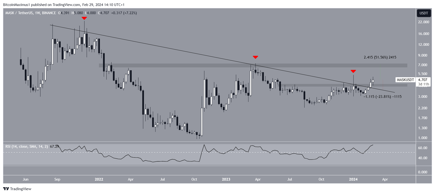 Despite the bullish MASK price prediction, failure to sustain the increase can trigger a 23% drop to the descending resistance trend line at $3.60.