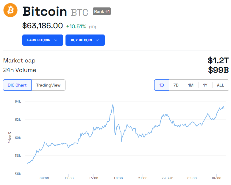 After starting at $57,074, the cryptocurrency experienced a dramatic 12.66% rise, peaking at an intraday high of $64,300 before undergoing a correction.