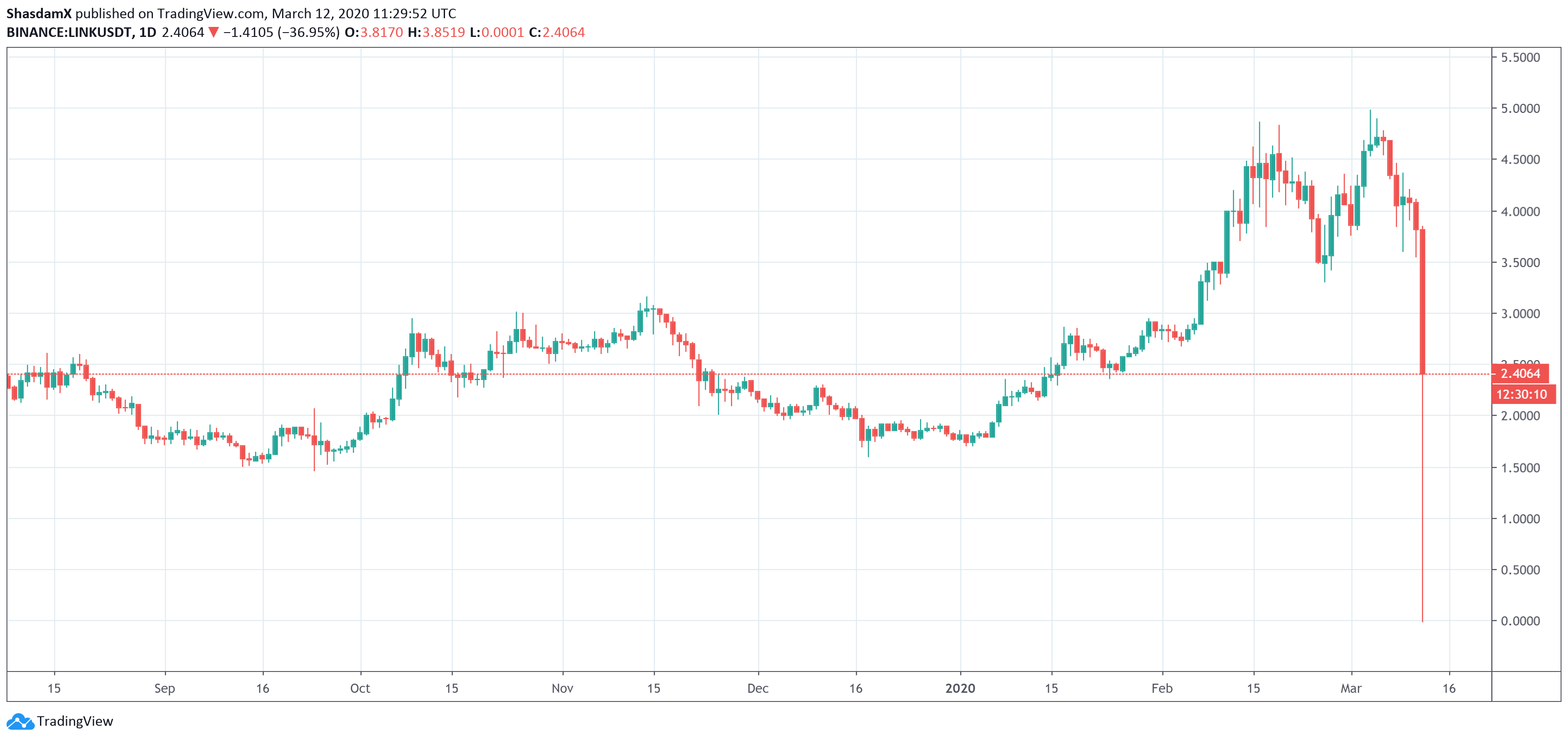 LINK flash crashed today on Binance’s LINK/USDT pair. Remarkably, the red candle dropped as low as it could possibly go: $0.00001.