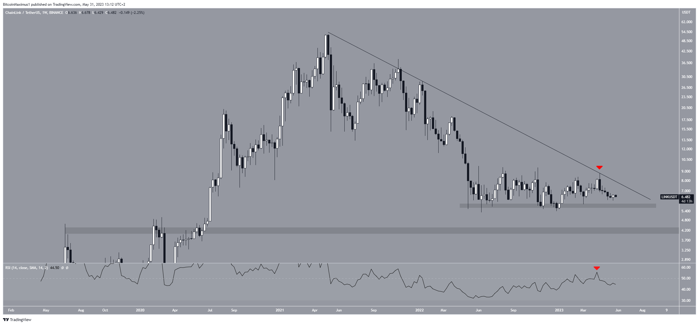 The weekly time frame outlook shows that the LINK price has decreased under a descending resistance line since May 2021. At the time, the price had just reached a new all-time high of $53.