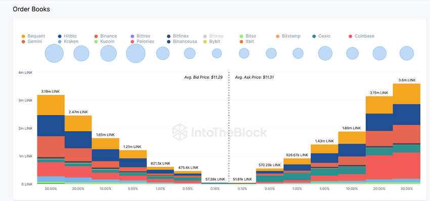 The Exchange Order Books Chart also validates the prediction. It shows that the current number of active sell orders for Chainlink has now exceeded market demand by approximately 1.2 million LINK.