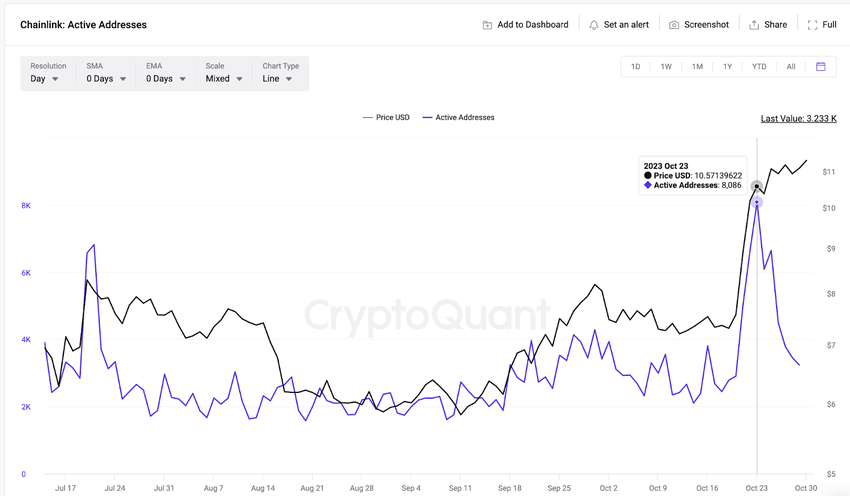 The CryptoQuant chart below shows that Chainlink recorded a 3-month peak of 8,086 Active Addresses on October 23. And barely 24 hours later, the LINK price rose to $11.50 for the first time since 2022.