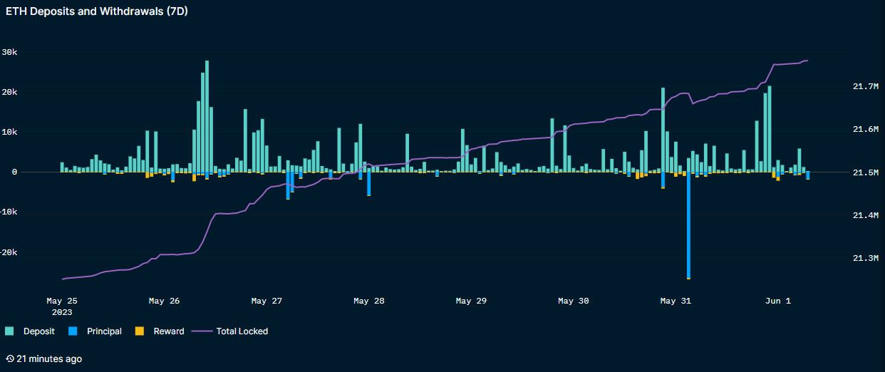 21.7 million ETH are currently staked, according to Nansen data. However, Beaconcha.in reports a much lower figure of 19.1 million.