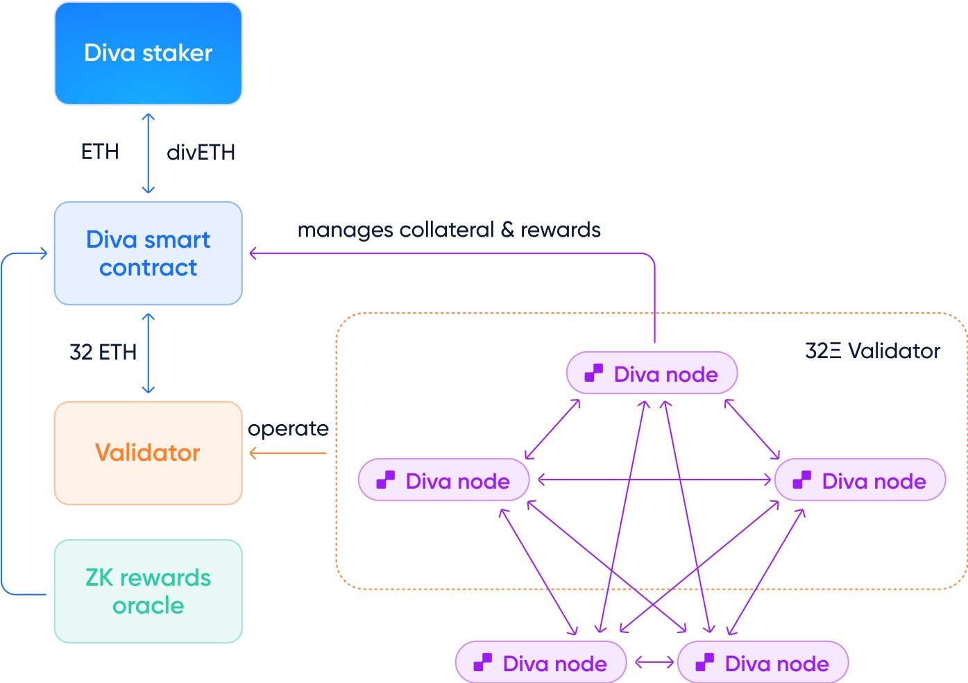 “The Diva Smart Contract receives ETH deposits from Liquid Stakers. Every time there are 32 ETH available, it deposits them to the Ethereum Consensus Layer to form a new validator, which is operated by 16 unique Key Shares to generate Staking Rewards.”