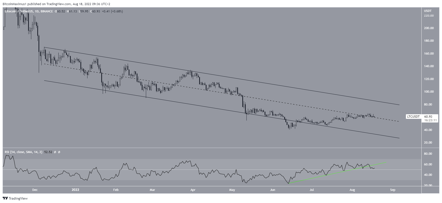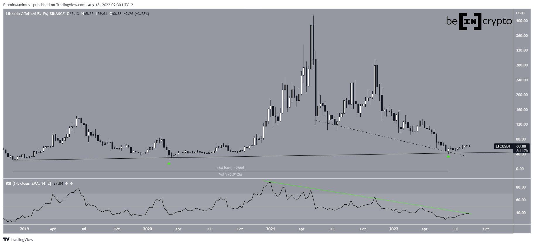 SponsoredLitecoin bounced afterward, validating an ascending support line that has been in place for 1,288 days. This is the third touch of the line, granting legitimacy to its slope. Furthermore, the price has also following a descending support line (dashed) since April 2021.