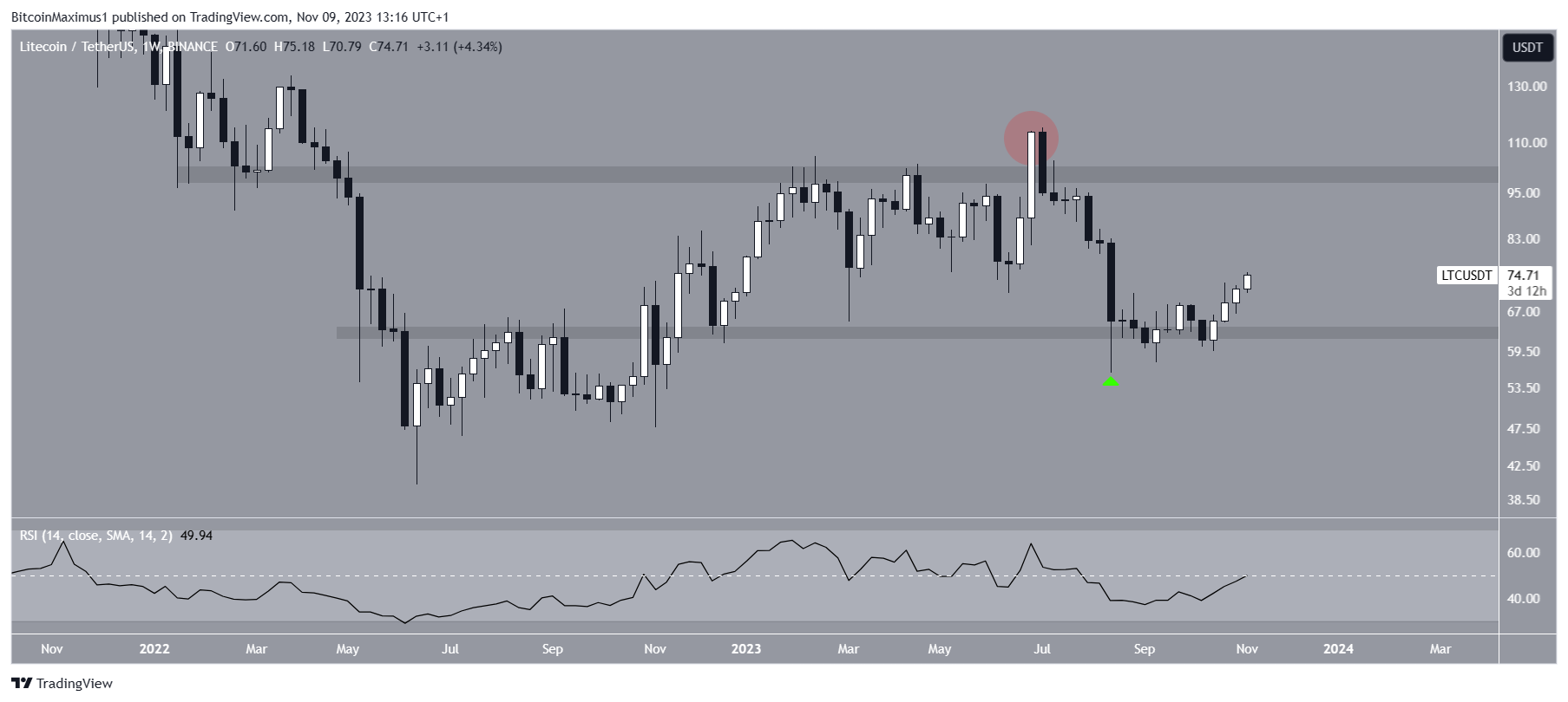 The weekly time frame technical analysis shows that the Litecoin price has traded in a range between $60 and $100 since November 2022.