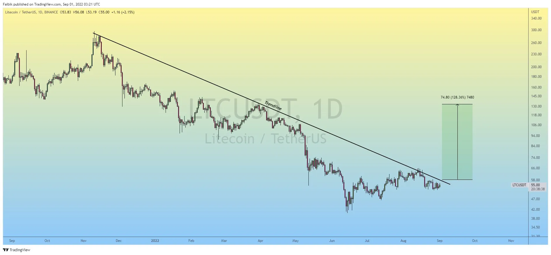 Cryptocurrency trader @CryptoFaibik stated that he expects LTC to increase all the way to $130 after breaking out from its descending resistance line.