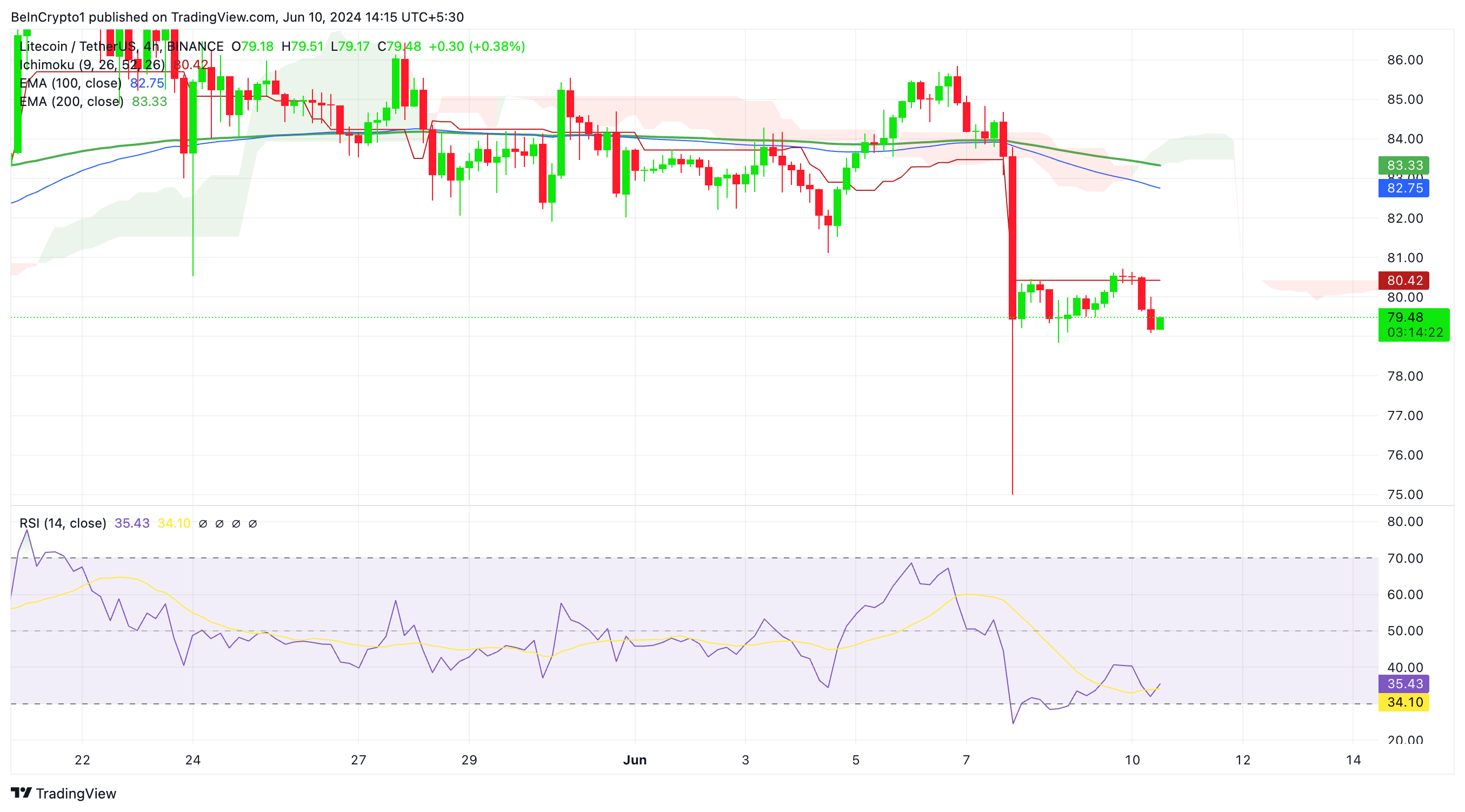 The 4-hour chart shows Litecoin trading 4% below critical EMAs: the 200-4H at $83 and the 100-day at $82.