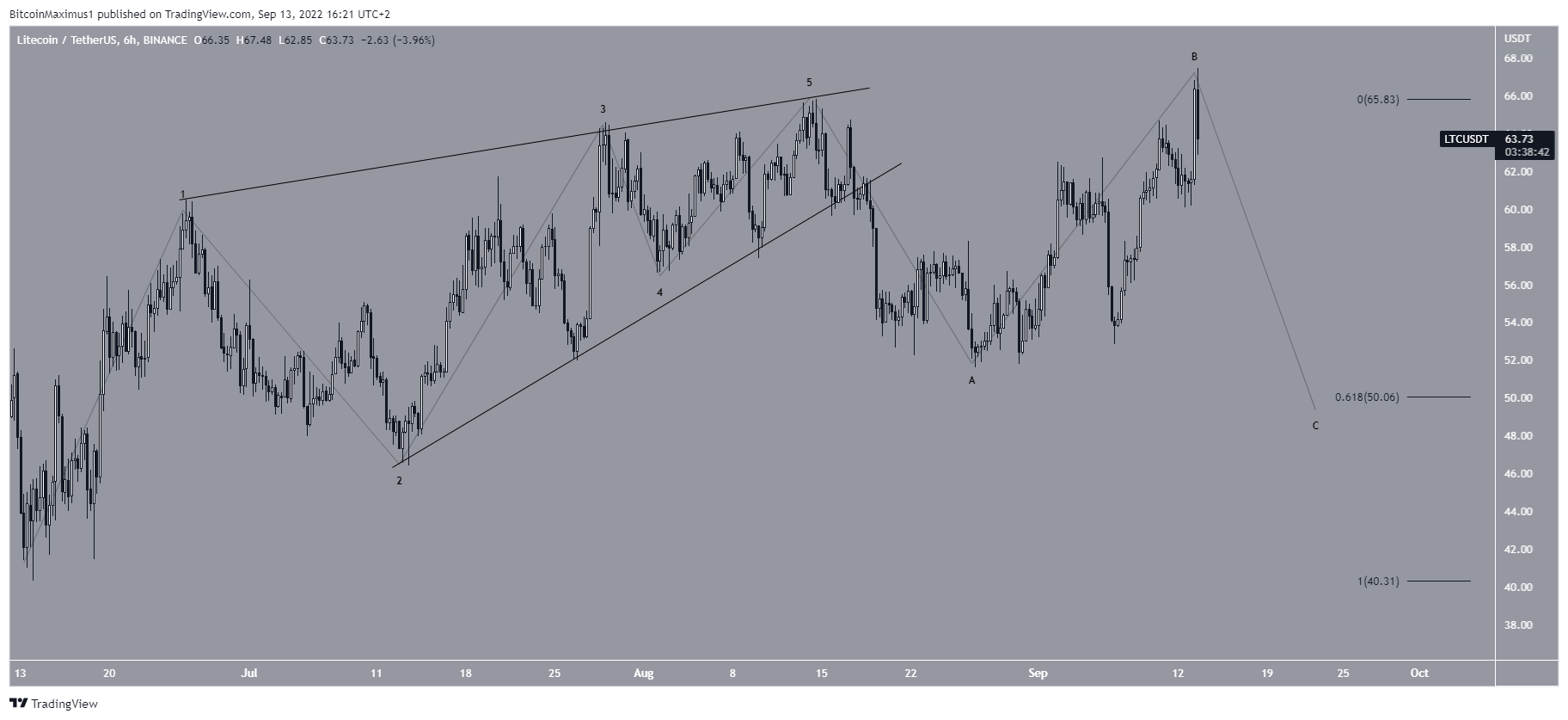 The wave count indicates that further downside is expected. Measuring from the June lows, it seems that LTC has completed a five-wave upward movement, which took the shape of a leading diagonal.